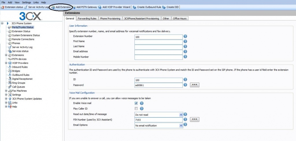 Enable voice mail Play Caller ID – the voicemail system will play the number of the caller who left the voice message Read out date/time of message – the voicemail system will play back the time of the voice message to be played PIN number – this pin number is used to protect the voice mailbox and is used by the user to access the mailbox. The PIN number is also used as a password to logon to 3CX Assistant or the MyPhone User portal.